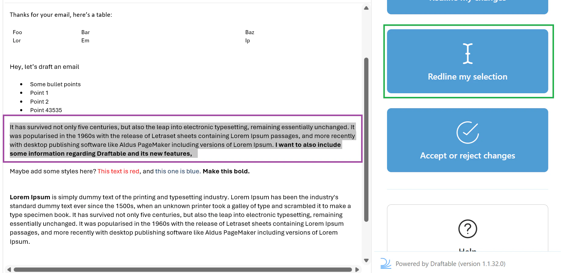 Once selected, a new menu will appear for you on the right-hand side of the email editor. You will have three options: Redline my changes, Redline my selection, or Accept or reject changes.Let’s first go over how “Redline my changes” works. If you want to skip to “Redline my selection”, skip to step 7. If you want to skip to “Accept or Reject changes”, skip to step 9.