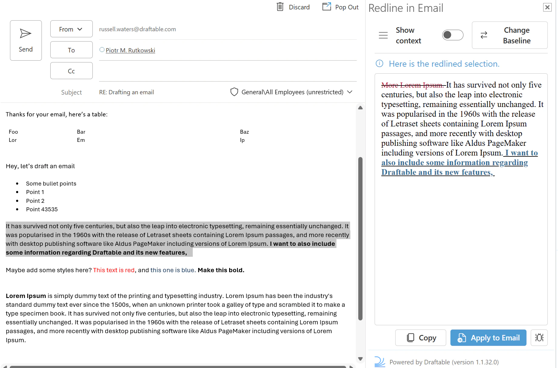 As you make changes in the email editor, these will automatically appear in the Email Redline preview window. Once you are satisfied with your changes, select “Apply to Email” on the bottom right side of the Email Redline window. Your changes will apply as below to your email draft as redline: