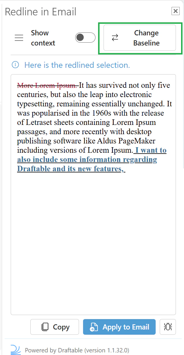 Once you are satisfied, select Apply to Email or Copy to use the redlined content, just as with the full “Redline my changes” workflow.