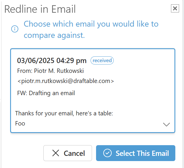 Once selected, the following window will appear. This window shows all the redlined changes that have been marked up by the sender of this email when they previously redlined the changes in their last email.