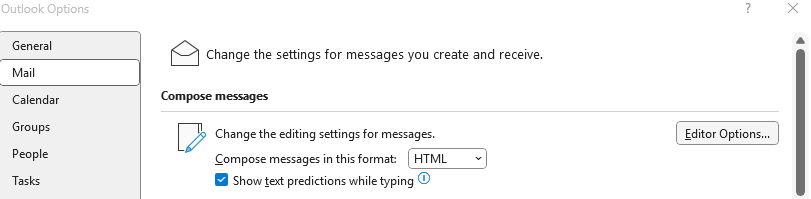Select Mail, and then under the section Compose messages, select Editor Options.