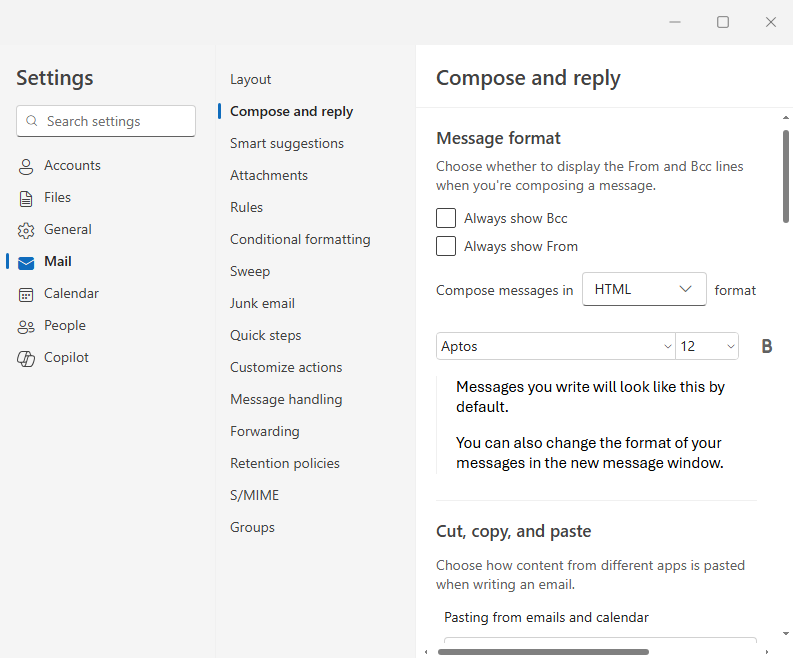 In the Compose and reply section, scroll down to the Cut, copy and paste section and ensure that Keep source formatting is selected for both drop-down menu options.