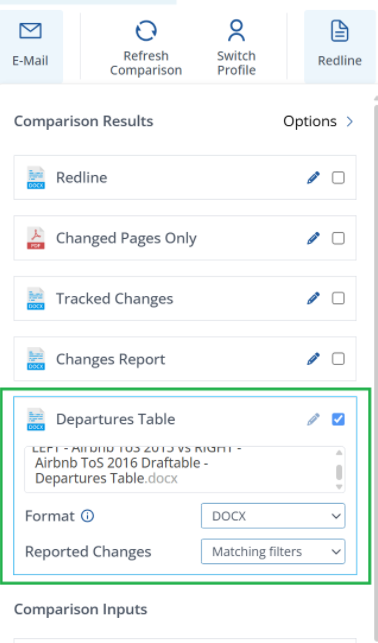 You can export a Departures Table from any Redline comparison using any of the export menu options.Creating a Departures table as a file