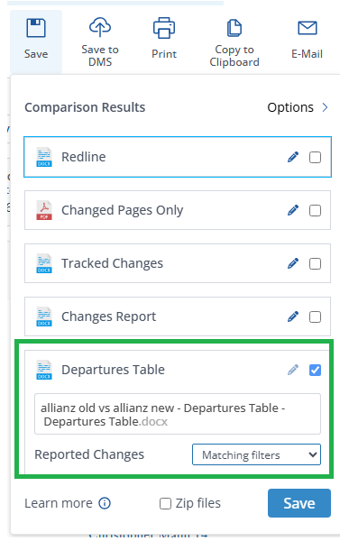 You have options to include all changes found in the Redline in the departures table, or only ones that match the change filter set within the comparison viewer. Once you have finished configuring your table, hit either Save, Open or Email, depending on the export workflow you are following at the bottom of the export window.