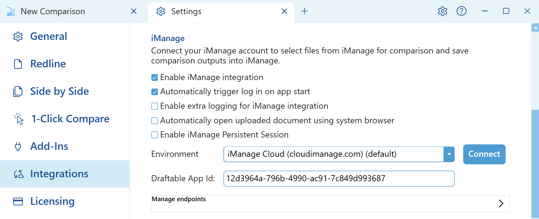 An iManage tenancy (also referred to as an iManage “environment” or “instance”) represents a unique deployment of iManage Cloud or On-Premise. Organizations often have multiple tenancies for different business units, regions, or clients. Previously, Draftable Legal supported integration with a single iManage tenancy at a time. With this update, users and administrators will be able to add, label, and connect to multiple tenancies from within the application, making it simple to compare and save documents from multiple environments without needing to log out.Configuring iManage Tenancies in Draftable Legal (In-App)