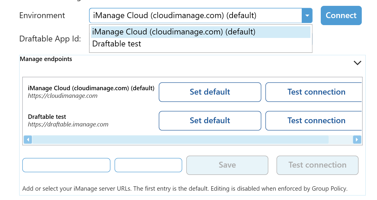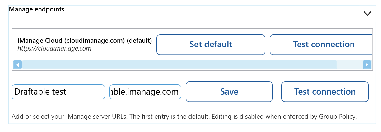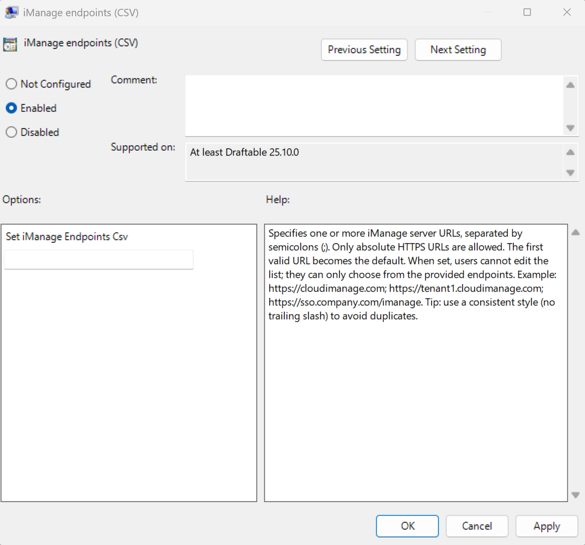 For enterprise environments, administrators can configure multiple iManage tenancies via Group Policy (GPO), allowing deployment across all users in a domain. This feature uses an updated administrative template (ADMX/ADML) included with the next release of Draftable Legal. There is only one group policy item that needs configuring for this, which is iManage endpoints (CSV).