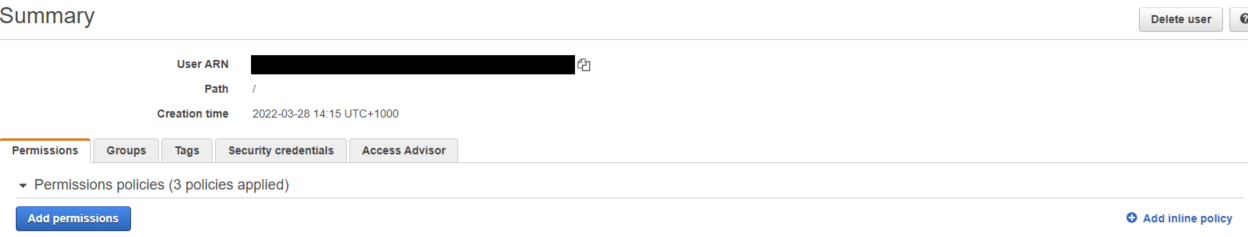 Ignoring the tags step, go straight to the review page. Ensure that the two policies we added earlier are present. If all looks good, click create user.