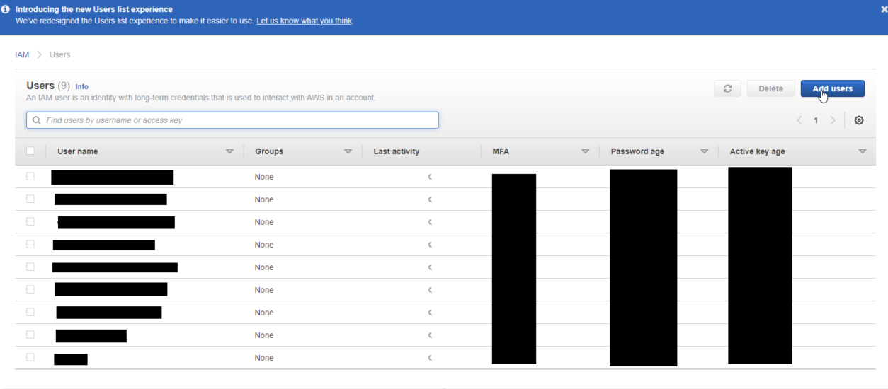 Navigate to your IAM users. We are going to create a new user by selecting the add users option. (Note: if editing an existing user account instead skip to step 5)