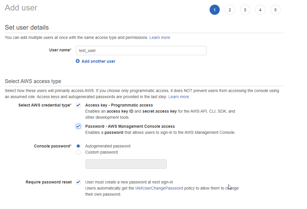 Enter details for the new user, ensure that you have the following AWS credential parameters enabled: Access Key and Password. Then click next.