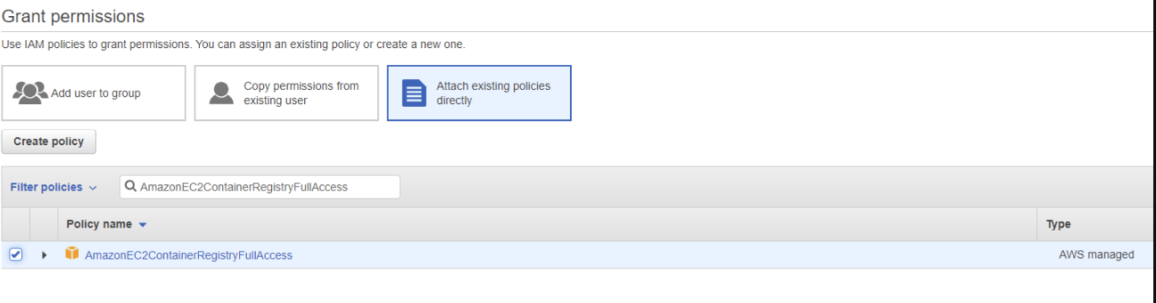 Open the user account again and go the permissions page. We to add an additional permission called AmazonEC2ContainerRegistryFullAccess. Add this policy and hit next, then add permissions.