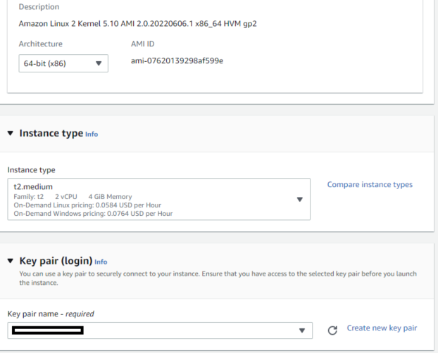 Continue to configure the instance by selecting a x64 architecture, and then selecting a instance type that is at least t2.medium or higher. Key pair should be the same one used as part as the login for the AWS user.