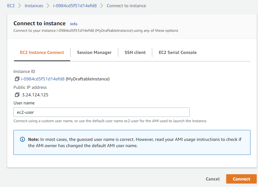 Select on your newly created instance and click on connect to your instance. Ensure the username s correct and then select connect.