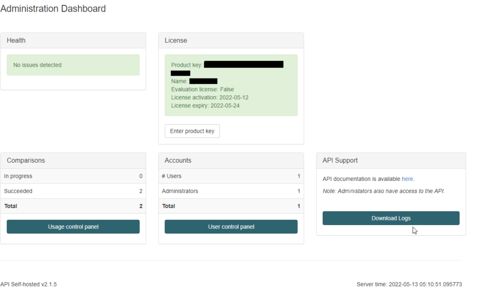 This takes you to the administrator dashboard, which houses critical information such as instance health, license information, access to to the usage and user control panels as well as log retrieval.