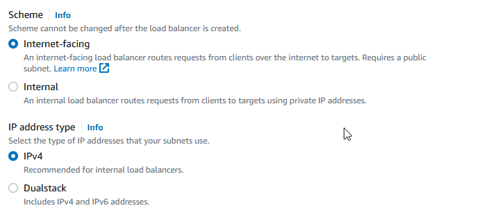 For Scheme and IP address type, select Internet-facing and IPv4 respectively. If you require different routing please refer to your own use-case for the correct settings.