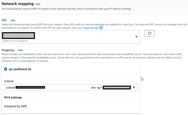 There are two components for Network mapping which are the VPC selection and Mapping configuration:- Select a VPC which will align to your target groups. Ensure you select the right VPC at this stage as you cannot change the VPC after configuring your load balancer.