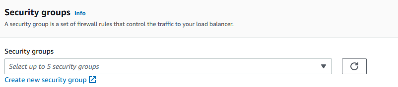 On the security groups dropdown box, select a security group that fits your security configuration scheme for your load balancer. If you need to create a new security group for you load balancer, select create new security group and assign it to this load balancer.